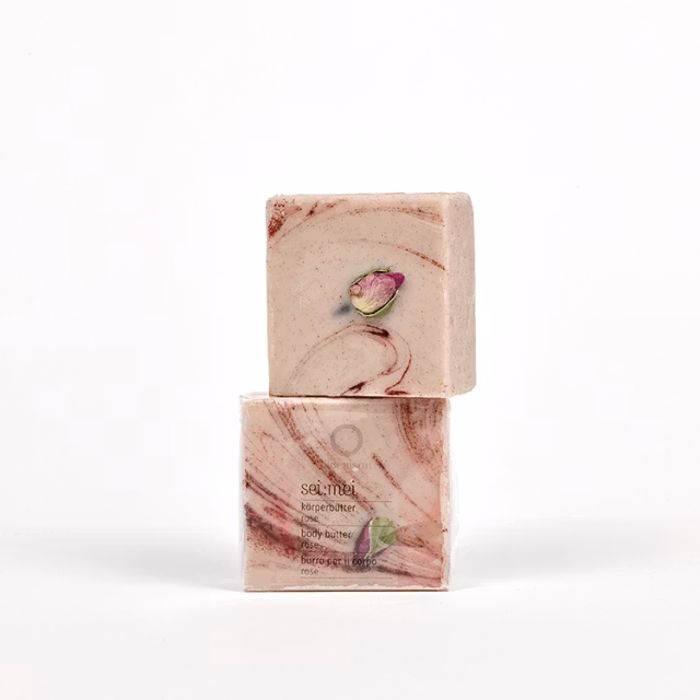 Bioemsan Bodybutter med rosdoft vårdar och lugnar huden. De värdefulla oljorna från vildros kombinerat med sheasmör och kakaosmör vårdar huden och ger en harmonisk upplevelse. Sheasmör innehåller värdefulla ämnen som allatoin, flavonider, fytosteroler, spårämnen och vitaminer. Allatoin verkar sårläkande, flavonider bidrar med näring till hudens celler och fytosteroler bygger upp cellmembranen. Vitamin E skyddar mot fria radikaler så hudens celler kan föryngras snabbare och stärker samtidigt hudens fuktbarriär. Vitamin A gör nya hud mjuk och elastisk samt stimulerar hudens produktion av kollagen.